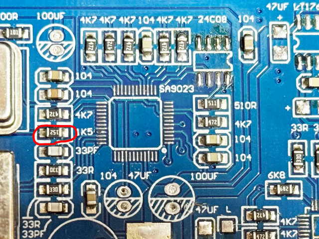 USBのDP入力が33Ωを介して,赤丸印の1.5KΩでプルアップされていた。