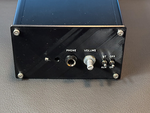 今年の6/27に基板だけ完成してネタにしたBluetooth搭載アンプがいよいよ必要になったので,ずっと先延ばしにしていたパネルを作成して完成させてみた。タカチのEX型アルミケースに実装したが,付属のアルミパネルを使って全面アルミで覆ってしまうとBluetoothの感度が鈍ってしまう。そこで最初はアクリル加工用の図面を書いてアクリル加工を依頼しようと思っていた。ただし,デジットのジャンクのスピーカーターミナルのように元の図面が無いものもあるので,ピタリ合うように作るには加工発注前に試作が必要。以前なら紙を印刷して厚紙に貼り付けて,そのままアートナイフでカットして試作なのだが,今回は先日のセールで入手した3Dプリンタで試作。でもまぁこれで試作するくらいなら,そのまま本番でも良いのではと思った次第。素材はよく使われるPLAだと強度イマイチで熱にも弱いので,PETGで作成。3Dプリンタだと表面は平滑にならないので,テプラで文字入れは諦めて,そのまま凸文字で文字入れしてみた。ここで表面だけ白フィラメントに交換すれば塗装不要だが,面倒なのでそのまま黒フィラメントで印刷し,あとでアクリックマーカーで白入れ。自家用なのでこれで十分。とりあえず市販品みたいな仕上がりで満足。音は申し分なし。結構良い感じに鳴る。