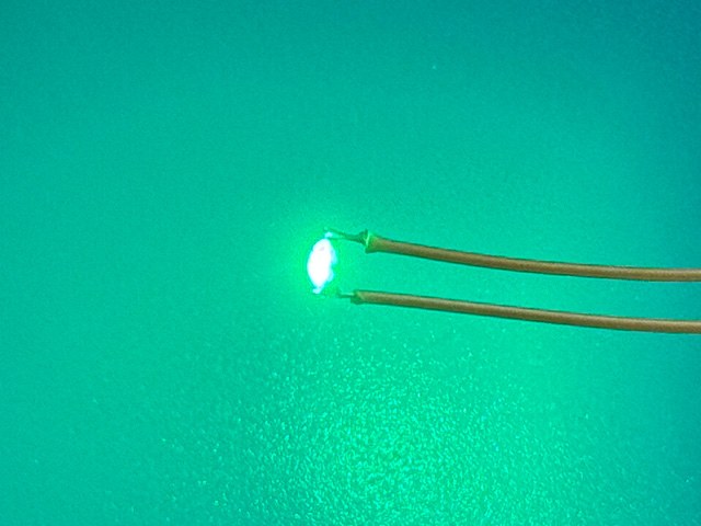 秋月2階の特価コーナーにあったスタンレー製サイドビューのチップLED UC1113F-TRを光らせてみた。100個100円。表面ではなく側面が光るタイプのチップLEDだ。2110サイズ(長さ2.1mm/幅1.0mmの略)。いつもの2012でないところがサイドビュー所以か。中華でないのも珍しいのだが,そもそもサイドビューなんて扱ってたかなぁ。販売完了品になっていたので,どこかのメーカーか問屋の在庫処分か。Vfが3V台の窒化インジウムガリウムLEDの国内ベンダ品をこういう店で見かけるのは珍しい。で,このLED,側面発光なのだが,電極を見ると発光面を上に向けても人力なら実装できそうな感じだ。というわけで,1個1円だし,折角細長いLEDなのだから,コイツでバーグラフLEDとか作って遊べないかなと思った次第。配線が超煩雑になりそうだが,秋月に置いてある東芝の定電流LEDドライバTB62706BFのようなドライバを近くに実装できれば可能かな。