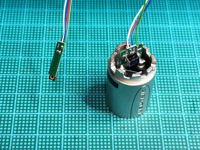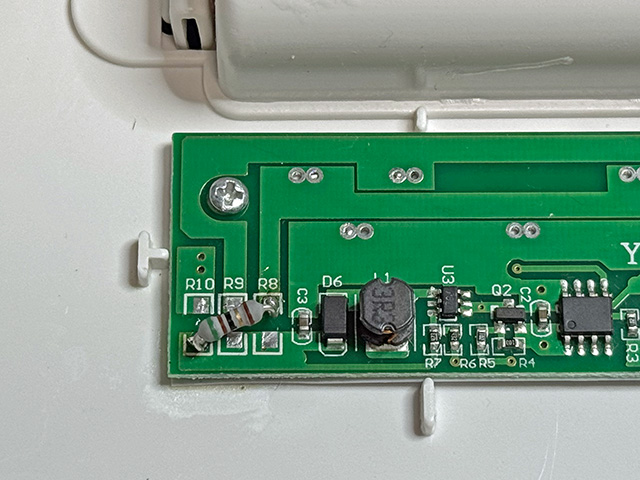 LEDの電圧降下VfはLEDのスペックがわからないので実測するしかない。UV-Aはともかく,UV-Cは毒なので紫外線保護メガネが必要。そんなものはもってないので,面倒だがリード線をハンダ付けして外に引っ張ってみた。結果は電源電圧がほぼ計算通りで7.24V,UV-C側のVfは6.54V,UV-A側は2.95Vだった。普通に計算するとUV-C側が33mA,UV-A側は14.3mAだ。あれれ,2つ合わせても0.26Wで,表記の2Wは程遠い。MT3608の出力電圧は固定値なので7.24V固定。多少の振れはありそうだが大幅に上がることは無い。完全にスペック詐欺だなこれは。おそらく,搭載LEDが1W定格のLEDで,それが2つついているから最大2Wと表記したものと予想。そうだとしたら実に中華らしい。まぁそれはおいといて,0.26WのままUV-A側に全振りしてみようと思う。R8(300Ω)とR9(20Ω)を撤去して,R8側に51Ωをつけてみる。これでVfがそのままならLEDに流れる電流は84mAに。2つ並列なので,1個あたり42mAで,合わせて約0.25Wだ。実際にはもっとVfが上がっていて,0.25Wには届いていないと思うが,実測は面倒なのでこれで打ち止め。早速レジンを硬化させてみると,普通に硬化する。これでUVレジン用ランプ完成。