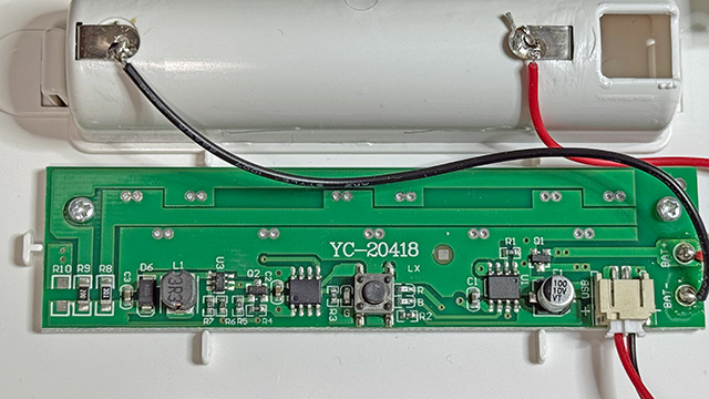 中の基板と18650電池ホルダ。剥がすと無保証になるよと書いてあるシールを剥がすと電池が外せるようになる。