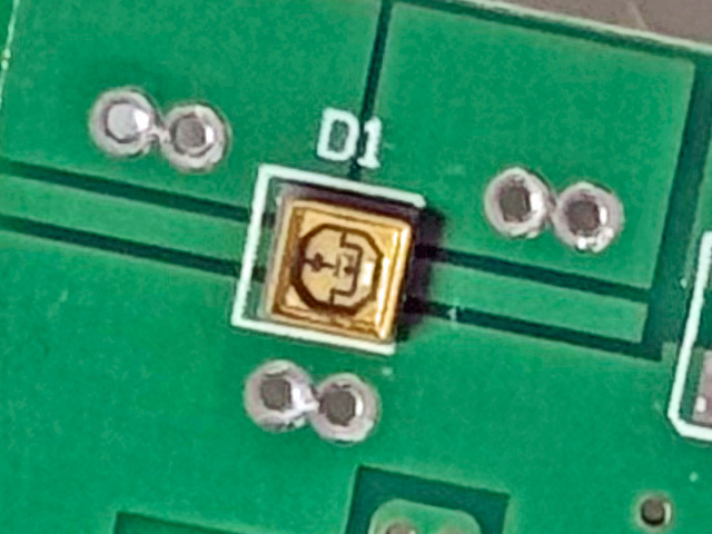 裏面に実装してあるLEDを拡大。レンズ内にチップが3つ見える。