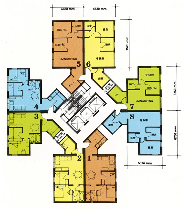 昨日の続き。宏福苑の間取り図が話題になってた。日本でいうところの公社の分譲のようなものらしい(分譲は上物だけで土地は英国時代からの伝統で国有地の定期借地権)。いわゆるポイントハウス。日本では日当たりを考慮して昭和30年代はスター,40年代以降はボックスやT字だが,香港の高層住宅街はそもそも日当たりなど気にしていられない過密度だし,そもそも南面は暑くてたまらんので窓なしも結構ある。風水は気にするので風の流れは良い。なので十字型の建物はそこら中にある。この建物は1つの階に8部屋。これが8棟。8並びというのはいかにも中華。一部屋あたり40平米くらいの2DK。バストイレ共通。香港名物のメイド部屋は無し。今回はメイドも何人か亡くなっているそうだが,この間取りだと雇っている人もそう多く無いと予想。各階にゴミ置き場があるのも香港らしい。
