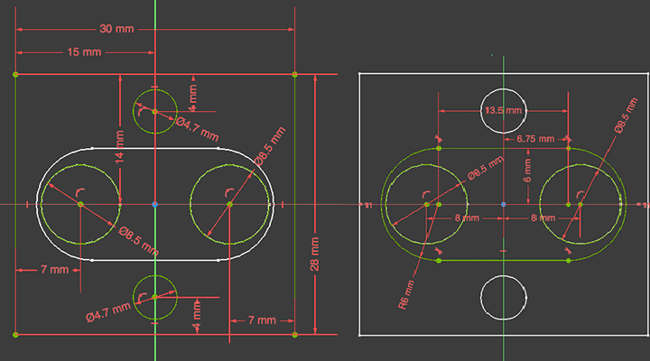 左右同じ図面で,右は中央の豚鼻の部分の寸法を記載したもの。コネクタ間隔は六角ナットの分だけオリジナルより広くする。