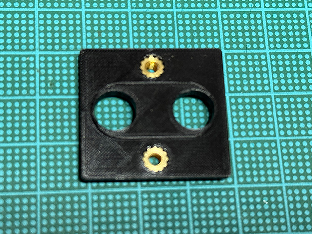 3Dプリントしたら,上下のビス穴にインサートナットを挿入。3Dプリンタ成形物用の鬼目ナットだ。