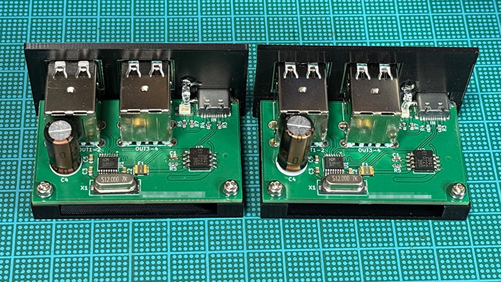 MTTバッファ付きのUSB2ハブの基板がようやく届いたので部品を載せてみた。先月もネタにしたが,MTTバッファとは12MのUSBを480MのUSB2ハブに接続する際に,ハブのポート毎にバッファを持つ方式だ。キーボード相手ならハブ全体で1つのバッファ(STT)でも性能的に変わらないので,大抵のUSB2ハブはそのような作りになっているのだが,そこにUSB Audioを複数接続すると簡単に破綻してしまう。そこでMTTバッファ付きのUSB2ハブが必要になる訳。USB2でMTTバッファ付きの市販品がどのくらいあるのかはわからんが,わざわざ明記されているのは高額な産業用しかないので自作した次第。使用したUSB HUBコントローラはCH334R。秋月扱いのCH335Fの弟分だ。これはUSBコネクタを接続するだけで4ポートのUSB HUBになる簡潔明瞭コントローラ。クロックの12Mはなくても動くらしいが,ブレッドボード上では何故か上手く動かなかったので載せている。で,これを日曜に3Dプリントしたケースに入れてみる。良い感じにピタリを収まる。機能もUSBハブとしては問題ない。ただ,オマケで入れたE-Fuseに問題が。使用したICはデジットのジャンク,富士通MB3841だ。抵抗1本で制限電流を決められるタイプ。で,コイツが電源投入時のコンデンサチャージで過電流検出するのだ。なぜこれがすぐわかったかって,オープンドレインの過電流信号に秋月のジャンク赤青2色LEDをぶらさげて赤く光るようにしていたから。通電時は青,過電流検出時は赤だ。このMB3841は過電流を検出すると,ロックしてしまい再通電しない仕様。この辺はやはり富士通。安全を優先したか。しかしこれが困った。最初の一発だけなので,USBコントローラ側から解除してやればよいのだが,CH334Rにそんな信号はない(上位機種ならある)。MB3841側もそこは考慮していて,スロースタートができるようになっている。この機能を使って数百mS遅れるようにしてやるとこの問題は半分回避可能。なぜ半分って,USBケーブルを抜いてOFFしたとき,すぐにONすると過電流検出状態になってしまうのだ。おそらくスロースタート用の時定数コンデンサのディスチャージが間に合っていないと予想するが,原因を探る元気は今はないので,とりあえず無視。時間をおけば問題ない。そういう訳で,このUSB2ハブ,さっそく実用にしている。いまのところUSB部分は問題なく動作している。