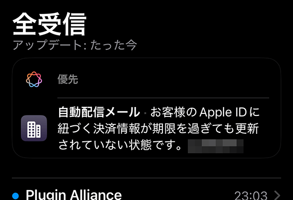 iOS 26.2なのだが,メールアプリの機能でAI(Apple Intelligence)が優先度の高そうなメールを選別してくれる余計な機能がついた。一見便利そうだが,このAIが大馬鹿で,こんな感じで詐欺メールを「優先」と表示する大ボケをかましてくれるのだ。まんまと騙された被害者がApple相手に訴訟起こしたら面倒な話になるよな,これ。