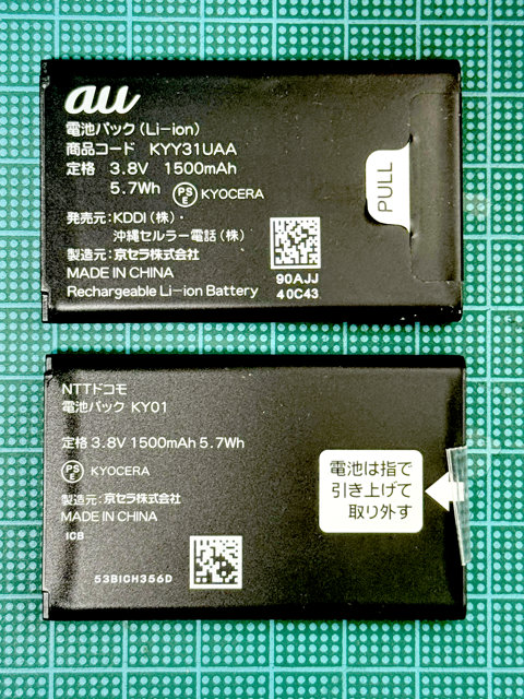通話用に愛用しているG'zOne TYPE-XXの電池がへたってきた。まだまだ使えそうだが持ちが悪い。4年も使っているので当然といえば当然なのだが,問題は電池パックだ。京セラのガラケーは何故か純正電池パックの流通が悪い。純正品はauのKYY31UAAだが,これはかなり前に入手困難になってしまっている。そこで中華の互換品以外で他に使えそうな電池を物色すると,ドコモのKY01が使えそう。早速入手して入れ替えてみたが,普通に使えそうだ(もちろん,自己責任で)。ただ,コイツは電池を引っこ抜くタブがついていない。これはスコッチの透明粘着テープで代用。熱を持つと面倒なことになりそうなので,あとで貼り替えるかね。