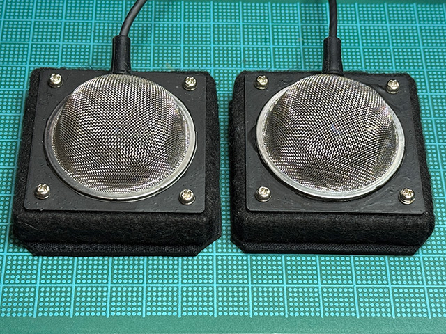 懲りずにまたマイクネタ。今月の演奏会ではグランドピアノのフレームの上に乗せて録音するマイクが必要になる。ピアノ蓋をあけると音量バランスが悪くなるので開けられないのだ。フレームの上に乗せて録音するマイクは昨年の演奏会用にも作成。昨年はECMのUEB-5361を使用。そこそこの音は録音できたが,演奏者がのってきてフォルテッシモになるとイマイチ。そこで今年はMEMSのInfineon IM73A135V01を試してみようと思った次第。回路はいつものShinさん回路。基板は以前作成したものを流用。MEMSマイク素子は基板にリフローした後,セリアにたまに置いてあるφ38mmのティーストレーナー(元はエコー金属のもの?)を分解したカバーの中に横向きに浮かせて収納。ケーブルは外径6mmのL4E6Sではピアノの蓋がしまらない。外径4.8mmのL-4E5Cでギリギリ。余裕を持たせようとするとモガミ2790(3芯)や2929(4芯)になる。シールドと3芯あれば十分なので,外径2.45mmの2790を選択。これなら大抵の隙間には通せそうだ。土台はアルミ切り出し10mm厚。ピアノのフレームに傷がつかないようフェルトを巻く。それとは別にティーストレーナーの半分を取り付けるベースをプリント基板で作成。これは一昨年,別のネタで試作してボツにしたものを流用。こいつとティーストレーナーを半田付けして,フェルトで包んだ土台にネジ留め。土台の下はダイソーのマウスパッドを切って貼り付けておく。これでとりあえず完成? はてさて。