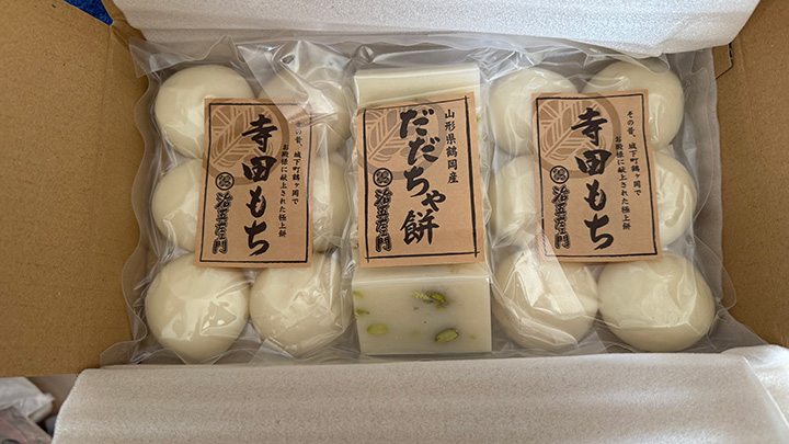 丸餅2パッケージとだだちゃ餅と,(写真にはないが)だだちゃ餡と普通の餡のセット